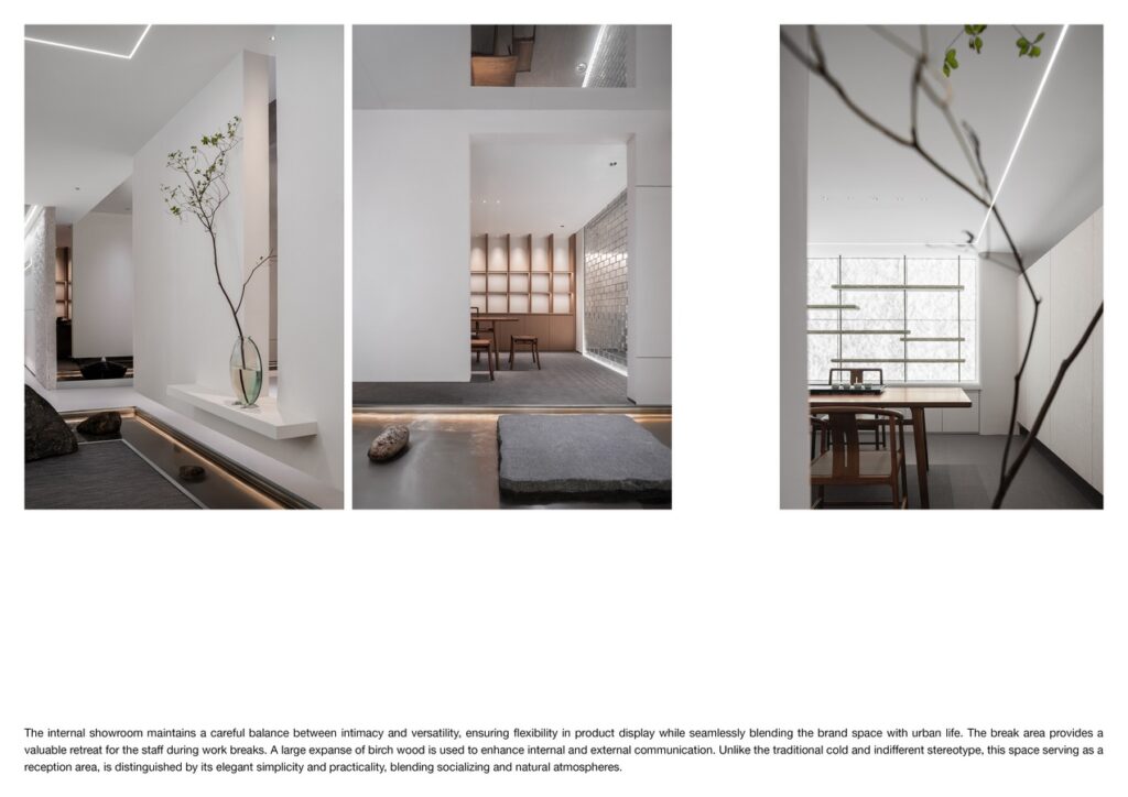 The internal showroom maintains a careful balance between intimacy and versatility, ensuring flexibility in product display while seamlessly blending the brand space with urban life. The break area provides a valuable retreat for the staff during work breaks. A large expanse of birch wood is used to enhance internal and external communication. Unlike the traditional cold and indifferent stereotype, this space serving as a reception area, is distinguished by its elegant simplicity and practicality, blending socializing and natural atmospheres.