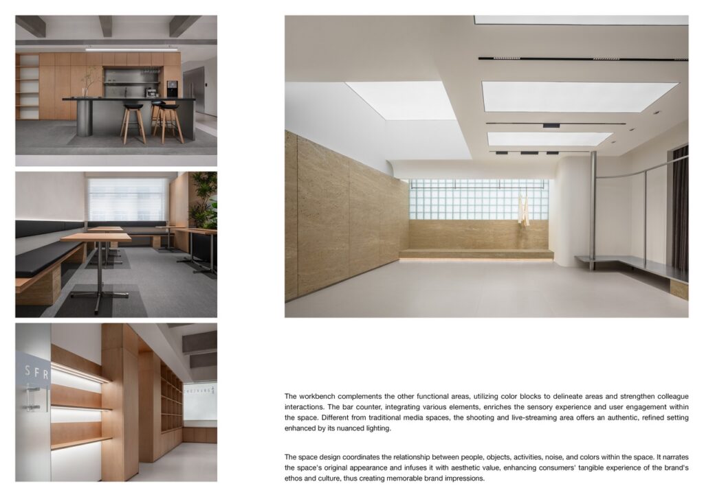 The workbench complements the other functional areas, utilizing color blocks to delineate areas and strengthen colleague interactions. The bar counter, integrating various elements, enriches the sensory experience and user engagement within the space. Different from traditional media spaces, the shooting and live-streaming area offers an authentic, refined setting enhanced by its nuanced lighting.